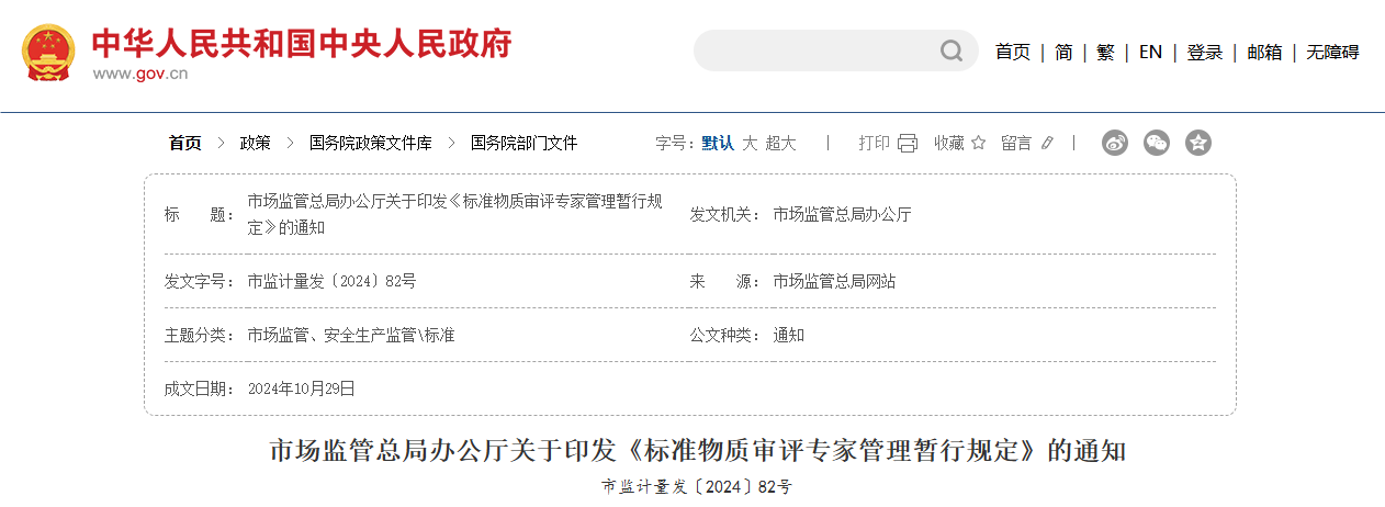 近日,市場監管總局印發《標準物質審評專家管理暫行規定》(以下簡稱《暫行規定》),共22條,旨在充分發揮專家在標準物質管理中的作用,規范標準物質技術審評專家管理,保證標準物質定級鑒定工作的質量和公正性。